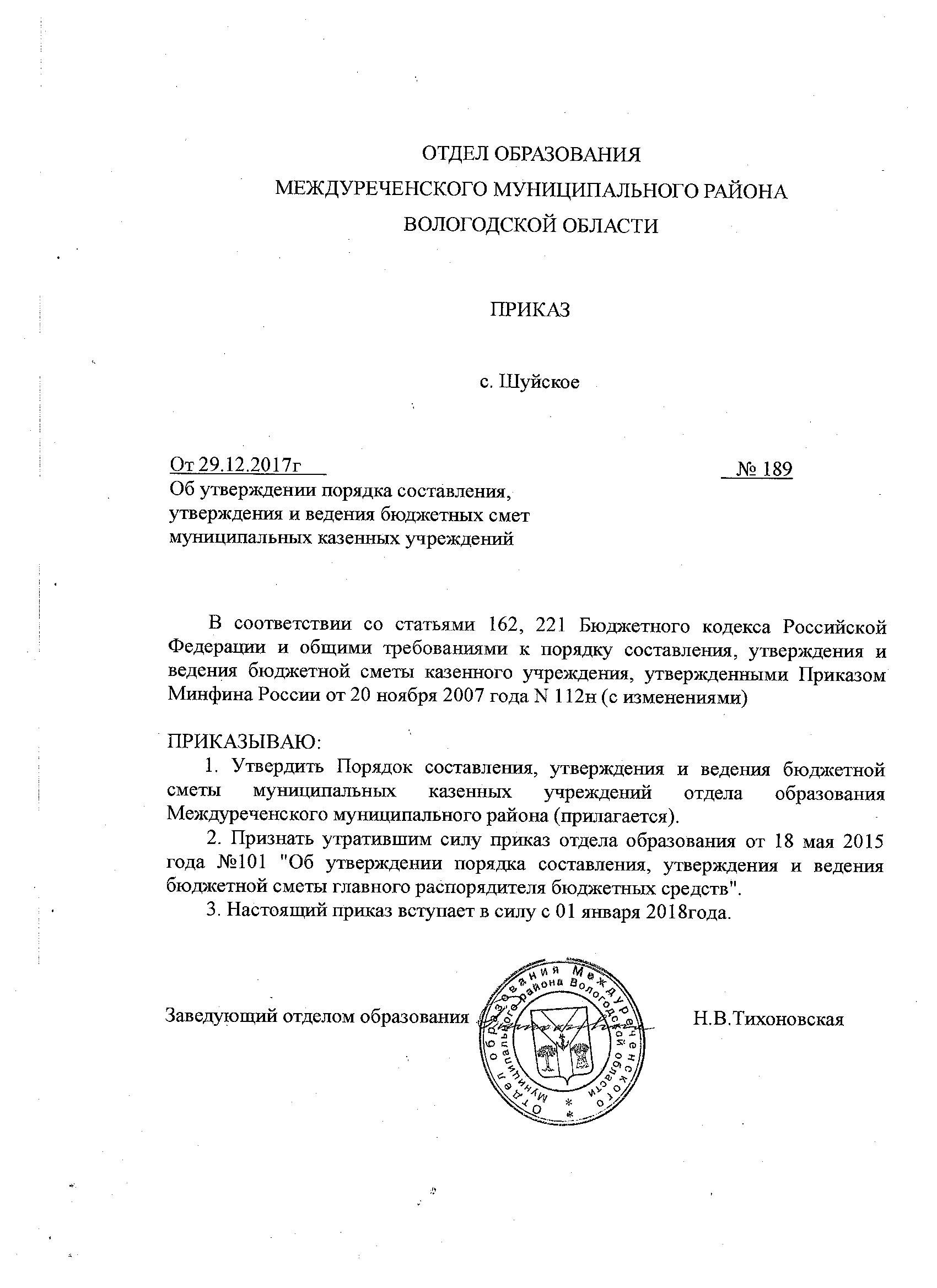 Приказ Об утверждении порядка составления, утверждения и ведения бюджетных смет муниципальных казенных учреждений.