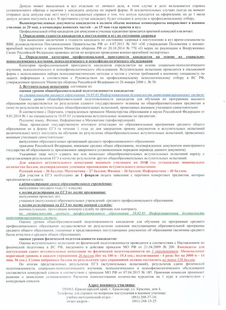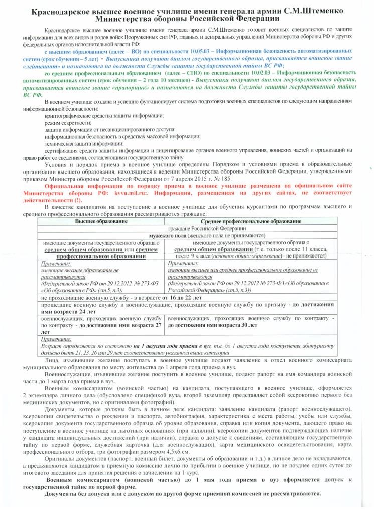 О поступлении в Краснодарское высшее военное училище им. генерала армии С.М. Штеменко